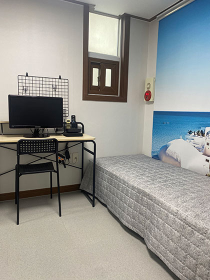 각방 침대, LCD TV겸 모니터, 냉장고, 책상, 의자, 수납장